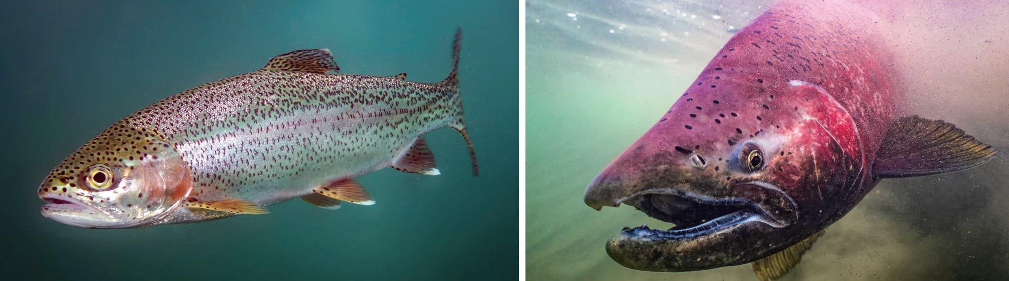生物学家最近探究了健康鲑科鱼类(包括图左的虹鳟鱼和图右的阿拉斯加帝王鲑)的大脑,发现它们是活微生物的栖息地