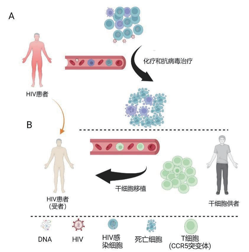 图1? 干细胞移植治愈HIV患者策略的主要共同点是供者HIV病毒受体携带CCR5Δ32/Δ32突变。移植前后及移植过程中持续给予抗病毒治疗。A.通过化疗杀死已感染了HIV病毒的宿主细胞,移植前需通过化疗或放疗摧毁患者免疫系统,清除已感染的HIV宿主细胞,破坏原有免疫系统与病毒库,为供体干细胞重建免疫系统创造条件,同时抗逆转录病毒治疗阻断病毒;B.供者提供可以阻止HIV病毒入侵的CCR5突变体干细胞,在受者体内重建免疫系统的同时,能使重建的免疫细胞免受HIV感染