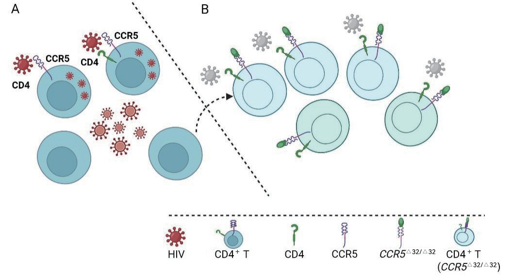 2025年1月报道的法国马赛患者(60岁左右女性HIV感染者)成为该国首例通过异体骨髓移植实现HIV功能性治愈的案例。该患者自1999年确诊HIV感染后接受抗逆转录病毒治疗(ART),2020年罹患急性髓系白血病,并行CCR5Δ32/Δ32纯合突变供体骨髓移植治疗,停药39个月后持续未检出病毒载量。CCR5是HIV入侵机体细胞的辅助受体,CCR5Δ32/Δ32突变能阻止HIV侵入细胞。截至2025年3月,全球共报道了7例经异体造血干细胞移植(HSCT)实现HIV长期缓解的治愈案例,其中6例供体携带CCR5Δ32/Δ32纯合突变。