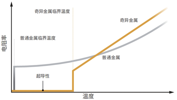 线性电阻率 在临界温度以上,奇异金属的电阻率随温度的升高呈线性上升趋势;在临界温度以下,奇异金属的电阻率直接降至零。而普通金属的电阻率随温度的变化沿一条光滑的曲线上升。