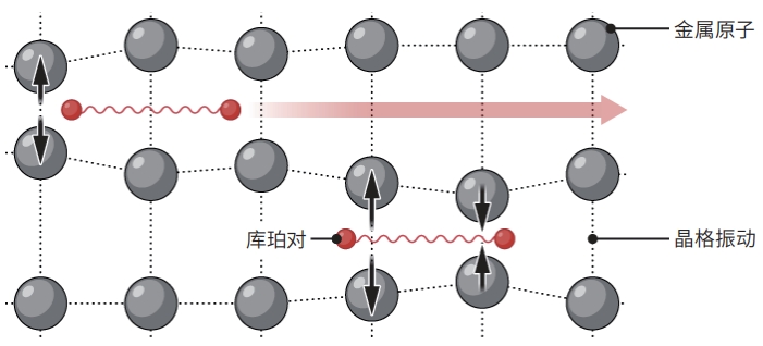 传统超导性 当温度接近绝对零度时,电子触发原子晶格(原子晶格将电子束缚成对,形成“库珀对”)振动,从而毫无阻力地通过金属
