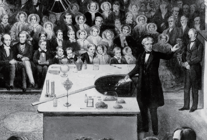 在小科学时代,科学精神传播的主体与传播路径比较单一,仅仅依靠学院科学家利用讲座等形式向公众介绍科学成果(图为法拉第于1827年举办圣诞讲座)