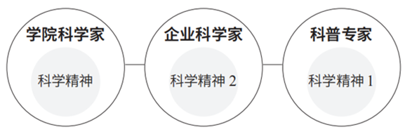 随着时代的发展,以及科技的突飞猛进,科学精神的内涵日益丰富,早已完成从1.0版向2.0版的演变,这就决定了传播科学精神的主体愈发多元化,因为任何个体都无法涵盖科学精神的所有层面。具体而言,主要包括如下三类传播主体:学院科学家、高科技企业科学家与专业科普工作者(图1)。三类传播主体与科学精神的特定内涵有如下关系。