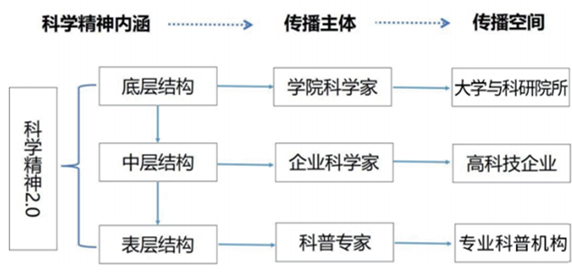 第一,科学精神的表层结构:求实精神/求真精神(基于科学知识生产过程衍生出来的精神特质,这也是科学精神1.0版的副产品)。第二,科学精神的中层结构:协作精神等(这是大科学时代科学有序运行的基本组织保障,也是科学作为一种社会建制得以运行的基本原则,否则美国的“曼哈顿工程”、中国的“两弹一星”这样的大科学工程恐怕很难完成;协作与民主可以看作科学精神2.0版的核心内容)。第三,科学精神的底层结构:批判精神和怀疑精神(基于理性和实证精神,这是科学精神1.0版的核心内容,也是最古老的科学精神基因)。用传播科学精神1.0版的模式与路径去传播科学精神2.0版的内容,注定是小马拉大车,很难实现预期中的科学精神传播的目标。