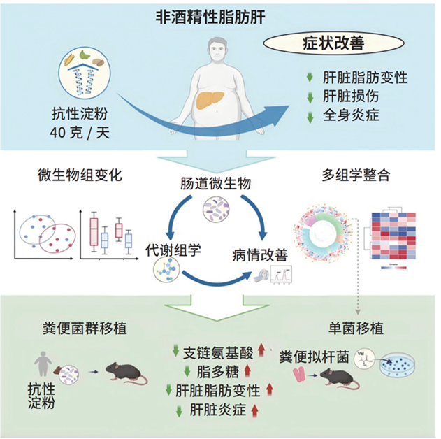 抗性淀粉与肝脏:为脂肪肝开辟新“食”代 非酒精性脂肪性肝病(NAFLD)是一种代谢性疾病,全球患病率高达25%,随着病情的不断恶化,会进一步发展为脂肪性肝炎,甚至演变成肝硬化和肝癌,并引发许多并发症,对患者的健康生活构成巨大的威胁。我们开展了一项针对NAFLD人群的随机、双盲、平行对照临床试验,发现抗性淀粉干预可通过调节肠道菌群来降低患NAFLD人群的肝内脂肪含量,提升患者健康水平。