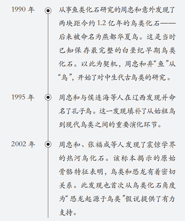 三十多年来,周忠和院士与同事发现并研究了一系列从恐龙到鸟类的过渡物种。他们通过系统发育分析、解剖学研究和功能推测,从形态和功能上建立了恐龙与鸟类之间的联系。