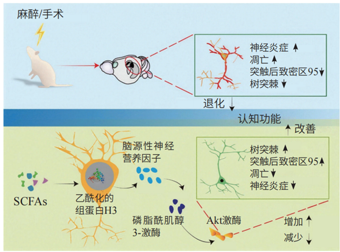 SCFAs —— 神经元的“营养剂”?以丁酸为代表的SCFAs,是我们吃下的膳食纤维被肠道微生物发酵后产生的有益物质。它们不仅能帮助维持肠道内健康的酸碱环境,还能促进保护性黏液的分泌,增强肠道屏障,守护我们的内在健康。更重要的是,这些小小的脂肪酸分子具有远距离影响大脑功能的能力。它们可以进入血液循环,并穿过血脑屏障,直接抵达与学习和记忆密切相关的海马部位。在那里,它们发挥着双重功效:一方面,SCFAs像“营养剂”一样,促进海马神经元的生长并增强其突触连接可塑性,这是学习记忆的基础;另一方面,SCFAs又能巧妙地“关闭”一些促炎因子的基因表达,减少大脑中有害的炎症因子,从而为海马神经元创造一个更适宜的局部工作环境。麻醉和手术常导致神经损伤和炎症反应,突触可塑性降低,导致在围手术期常见的认知障碍。王秋筠团队的研究发现,围手术期出现认知障碍的大鼠肠道微生物群失调,并伴随SCFAs水平的改变,补充SCFAs可以减轻海马神经元损伤和炎症反应,并恢复突触可塑性,从而改善大鼠的认知功能(图3)。