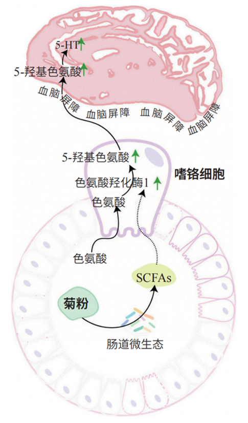 2024年,昆明医科大学李宽团队在《植物医学》(Phytomedicine)期刊上发表了一项研究,该研究观察到,摄入酒精会诱发小鼠出现类似焦虑和抑郁的行为。研究团队深入分析后发现,这是因为酒精破坏了肠道屏障功能,干扰了中枢神经系统内的5-HT功能。而补充益生元菊粉则显示出积极的治疗效果:菊粉改变了肠道微生物群构成,能有效调节5-HT代谢并增加大脑中5-HT的浓度。由此可见,肠道健康,尤其是肠道菌群的平衡,对维持正常的5-HT系统功能具有重要意义。