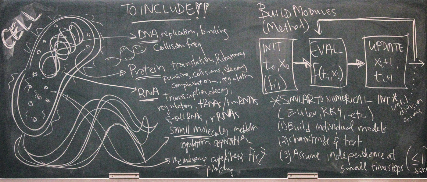 2012年,现就职于西奈山医学院的计算系统生物学家乔纳森 · 卡尔(Jonathan Karr)与斯坦福大学的同事共同推出了首个全细胞模型——生殖支原体的硅基版本。之所以选择这种微生物,是因为其基因组是当时已知细菌中最小的——仅含500多个基因,而常见的大肠杆菌则有4000多个基因。为复刻该生物体的代谢过程,模型计算了700多种代谢物在1100个化学反应中的浓度变化。通过对染色体和蛋白质合成细胞器(即核糖体)进行建模,这个模拟细胞在一定程度上还原了真实细胞的内部结构。